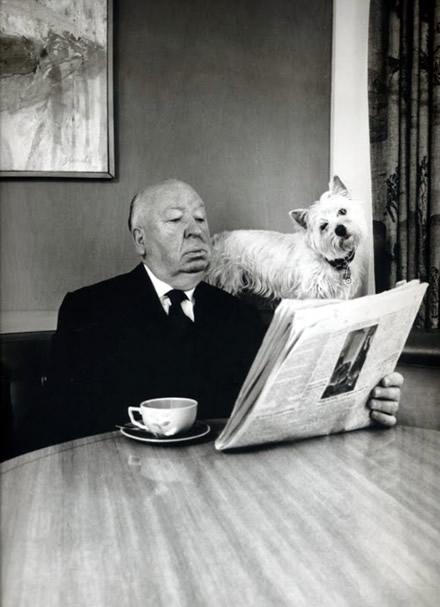 Alfred Hitchcock and his Dog reading the news