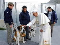 A group of German St. Bernard's visited the Vatican today to pay homage to Pope Benedict XVI. When the Pope, a great lover of dogs, gave one of the pooches a friendly pinch on his haunch, the poor pup let go an embarrassing payload of poop--right on the pungent Pontiff's silk slipper! Said a Vatican insider "The dog's owner was mortified! But His Holiness simply shook the poop off the soiled slipper and blessed the relieved dog." [March, 2010]