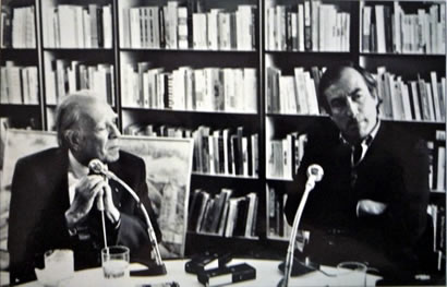 [Foto: Jorge Luis Borges y Tomás Eloy Martínez en una entrevista pública en la capital de Venezuela (1979)]