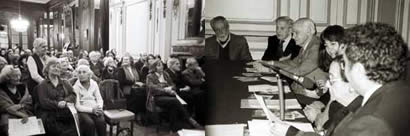 [Foto -de izquierda a derecha: Melograno Lecuna, Betina Edelberg, Sara Luisa del Carril, Silvia Renée Arias, Gerardo Lehmann, Miguel Eduardo Dolan, Horacio Salas, Jovita Iglesias -de pie hablando desde la audiencia- ... en el homenaje a Georgie Borges y su 'joven maestro' a quien tanto quiso Adolfito Bioy Casares; organisé par la Sociedad mundial de Amigos de Jorge Luis Borges, celebrado en el Hotel Club Francés de Buenos Aires, Agosto 2002]